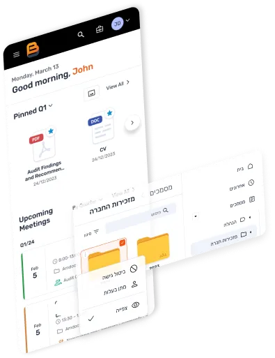 שליטה מלאה על ניהול הוועדות, הישיבות והמסמכים שלכם. בעזרת המערכת תוכלו להפיץ באופן מאובטח סדרי יום וחומרי ישיבה, ליצור ולערוך פרוטוקולים בקלות, ולשלוח אותם לאישור והערות.